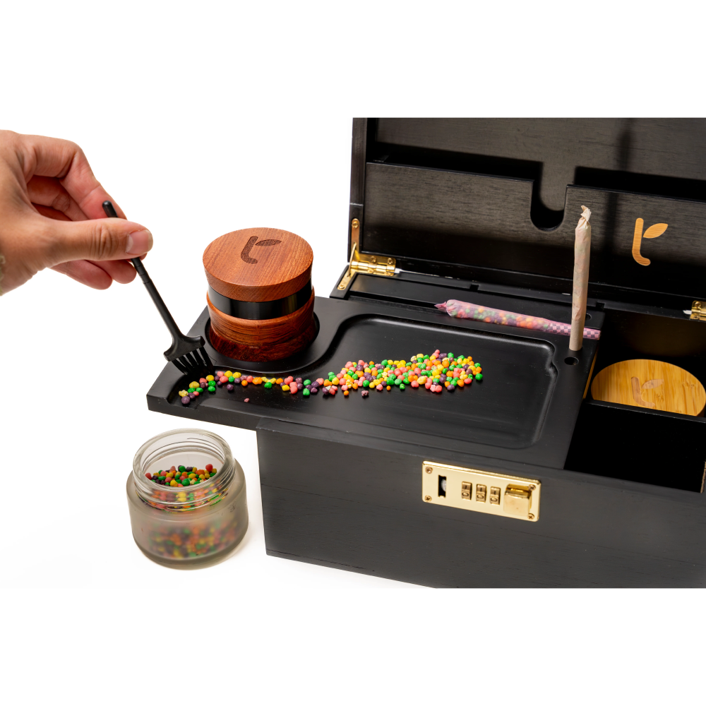 The ultimate stash box, crafted with premium accessories including a sleek rolling tray, three elegant glass jars with natural finishes, and a cleaning brush for effortless upkeep. Designed to keep your stash odor-free, secure with a child-safe lock, and sustainably crafted with an eco-friendly design.